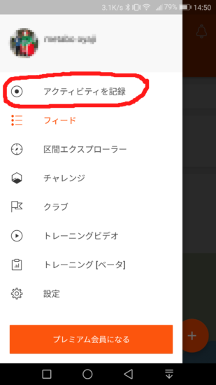 ②スライドしてメニュー表示しますので、一番上の「アクティビティを記録」を押します。